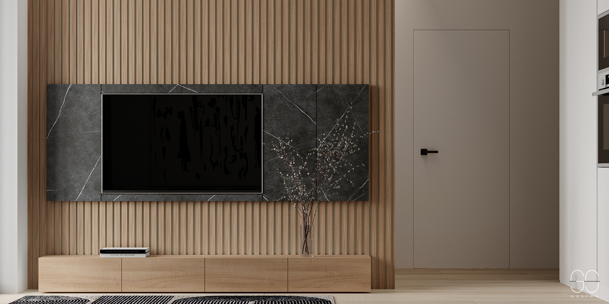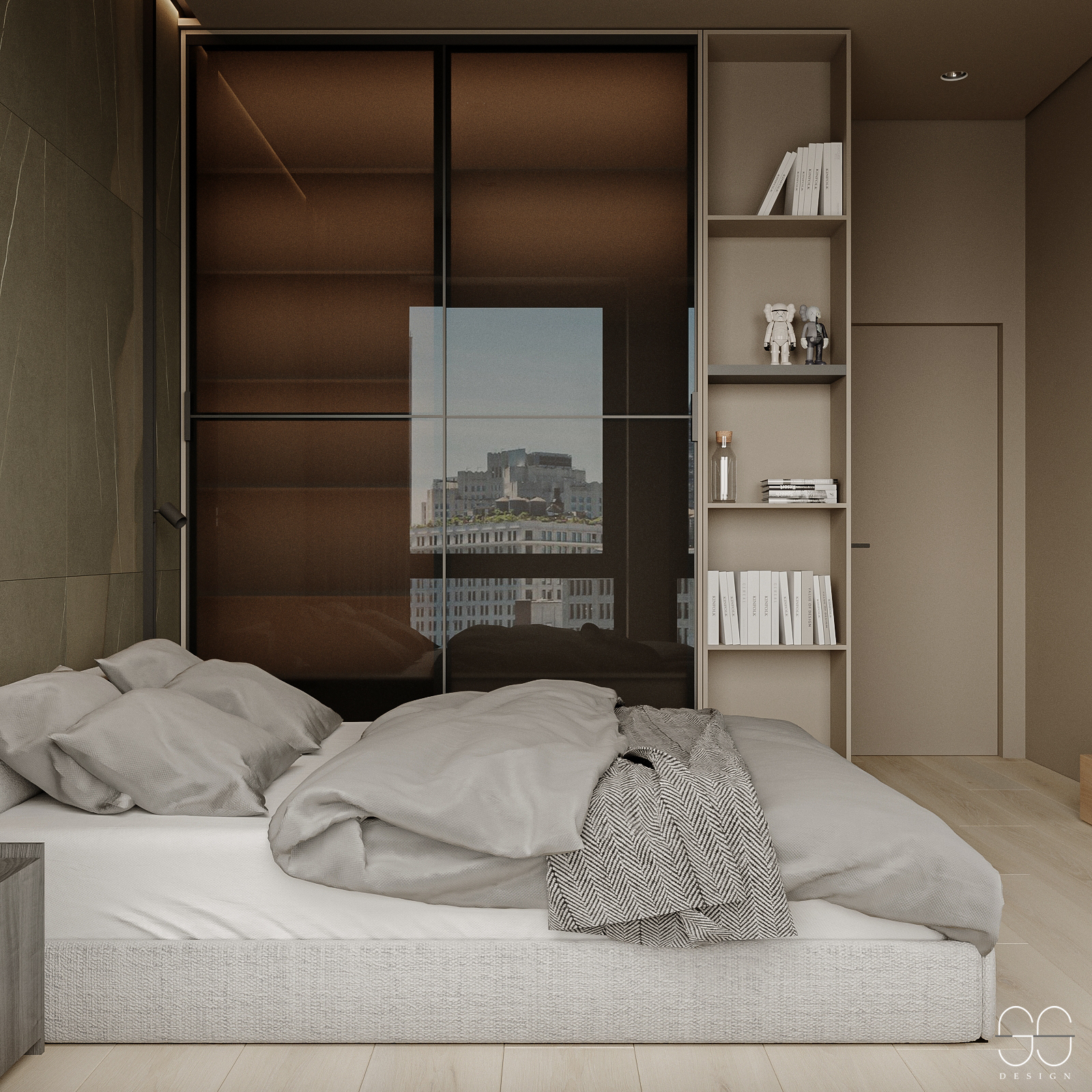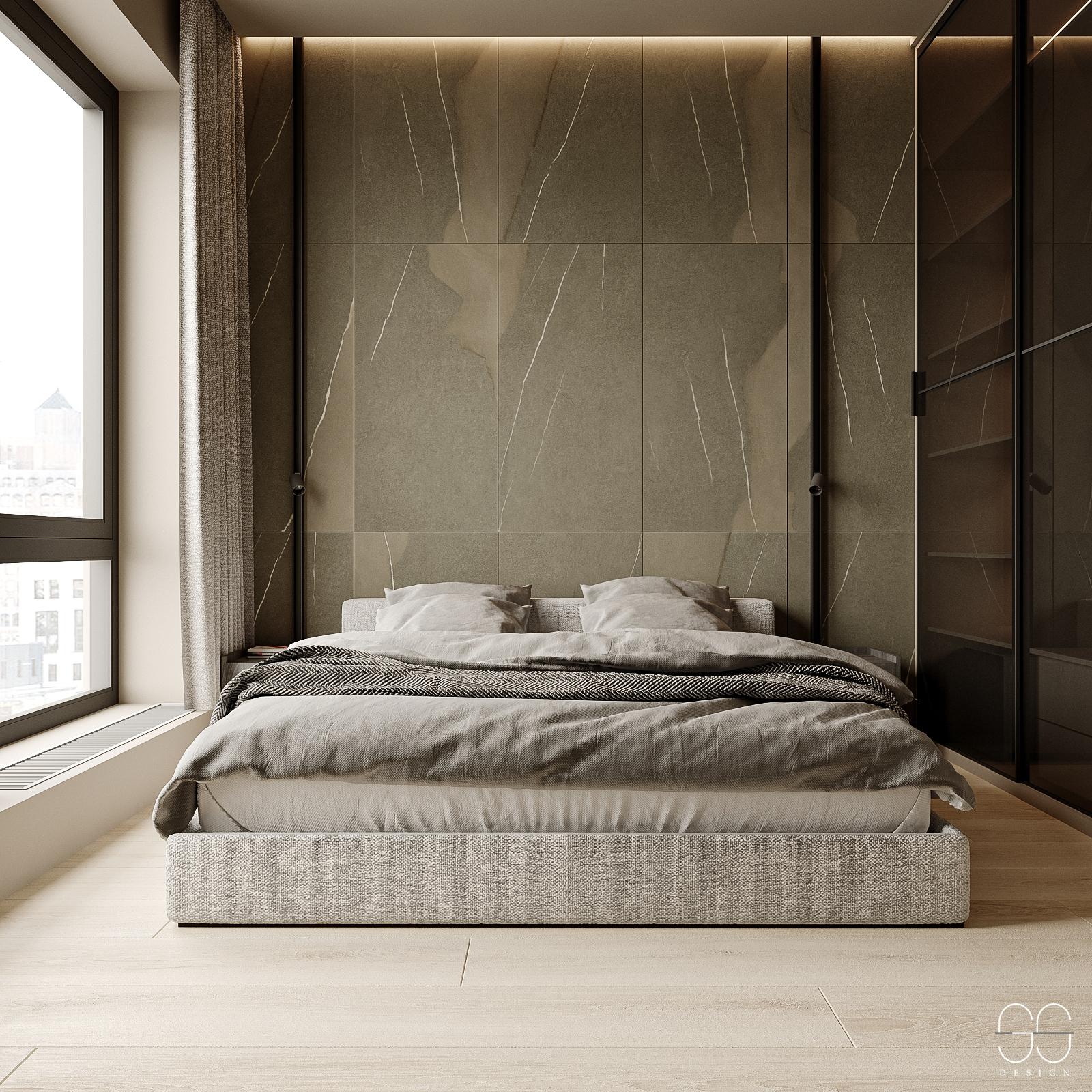 Одним из решений были декоративные рейки по периметру стен спальни, что позволило скрыть приватную зону клиента, сохраняя при этом общую гармонию интерьера.