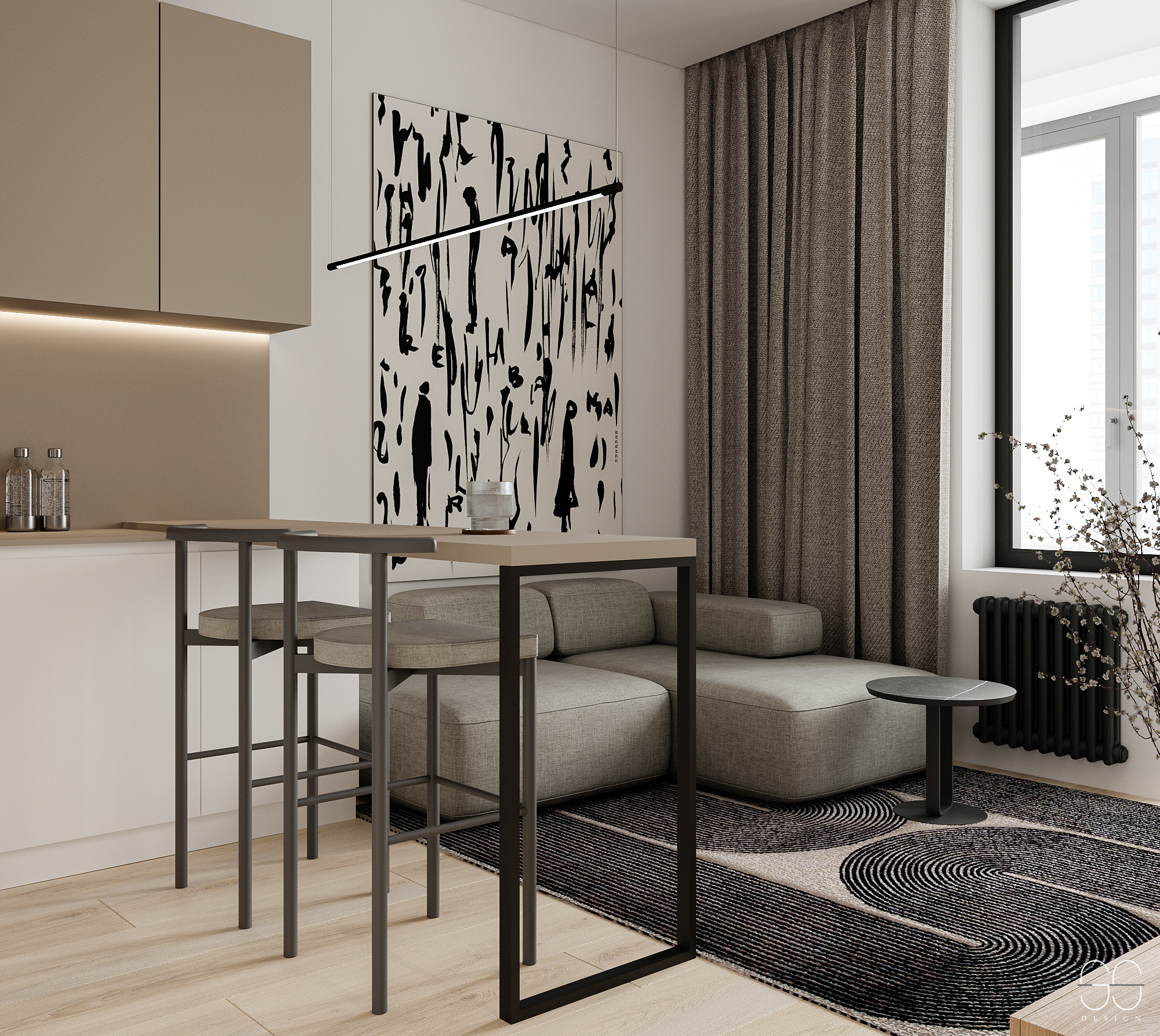 Дизайн-проект квартиры для молодой девушки в Санкт-Петербурге в 2022 году был разработан в современном стиле. Основной задачей было создать функциональную и комфортную планировку в условиях ограниченного пространства. Для достижения этой цели было решено объединить прихожую, кухню и барную стойку, что позволило визуально расширить пространство и улучшить его функциональность.